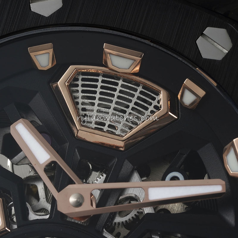 The dial features a multi-layered skeleton layout, revealing the mechanical depth of the movement beneath. Rose-gold applied markers and hand-finished bridges deliver warmth against the mechanical structure, creating a perfect contrast between engineering and luxury. Air-intake–style mesh panels frame the upper dial, enhancing the watch’s futuristic appearance. Every angle reveals an intricate play of depth, allowing light to move through the open-worked sections and highlight the fine structure of the tourbillon.
