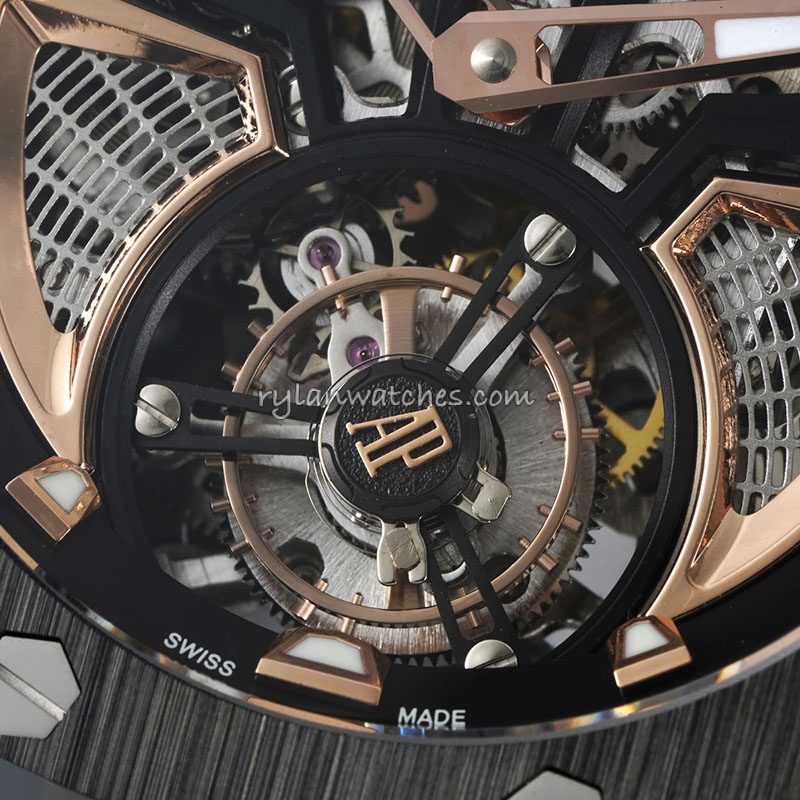 At the heart of this timepiece is a Swiss tourbillon movement designed for accuracy and aesthetic impact. The tourbillon cage rotates visibly at six o’clock, echoing the movement style found in authentic Royal Oak Concept variations. The mechanism runs with exceptional stability, ensuring precision even during dynamic wrist activity. Each component is finely brushed, beveled, and polished, offering a mechanical spectacle visible through the sapphire crystal.