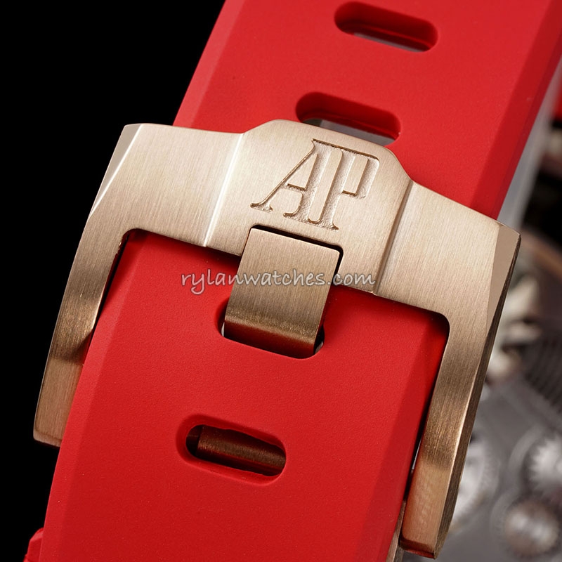 This UAE edition clone features a bold red AP-style rubber strap, molded with original-spec geometry and deep embossed channels for flexibility. The strap is paired with a sturdy pin buckle engraved with the AP signature, delivering a secure and premium wrist experience.