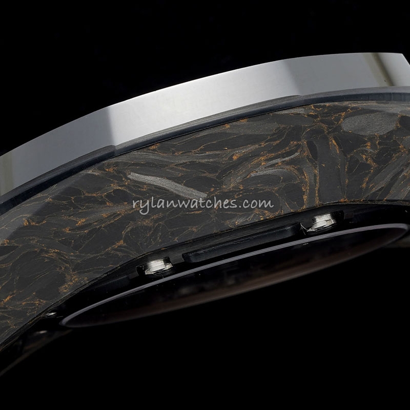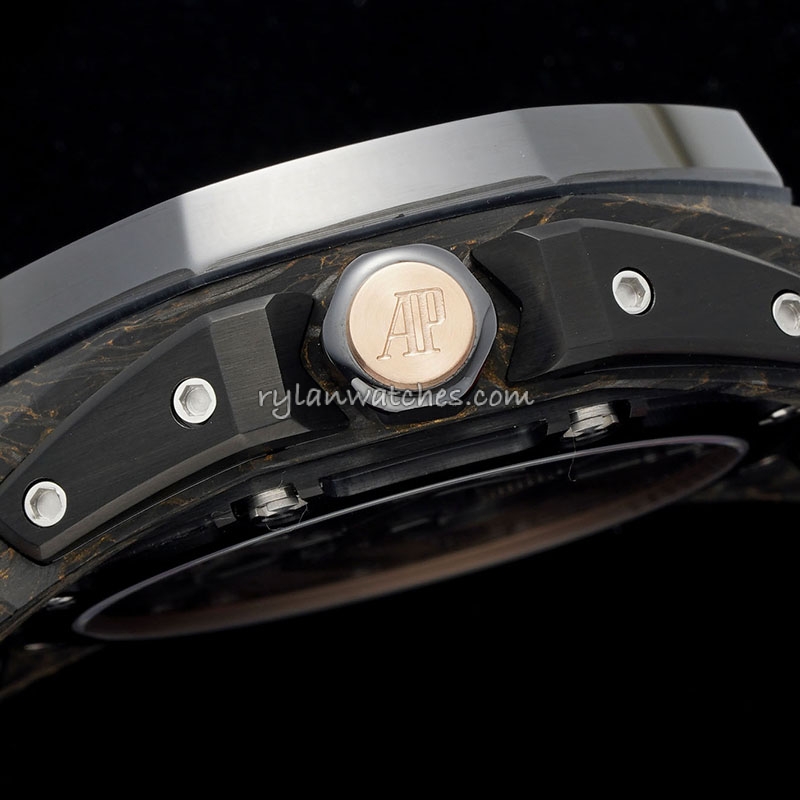 The case is crafted from forged carbon, mirroring the swirling patterns and lightweight strength of the original. This unique material gives the watch a rugged yet premium character, blending matte carbon textures with subtle gold-toned marbling. The facets and angles of the Concept case architecture are precisely sculpted using CNC machining, ensuring sharp geometry that remains faithful to the original AP proportions.