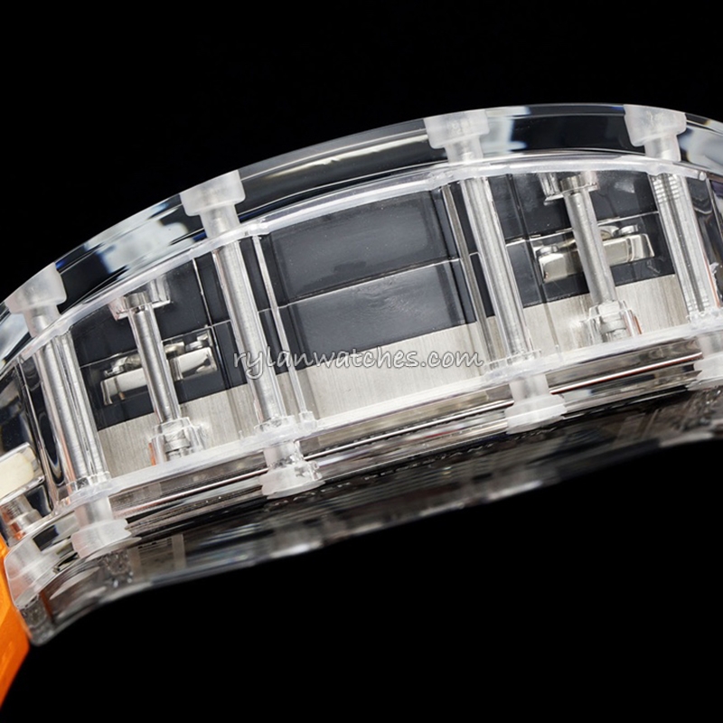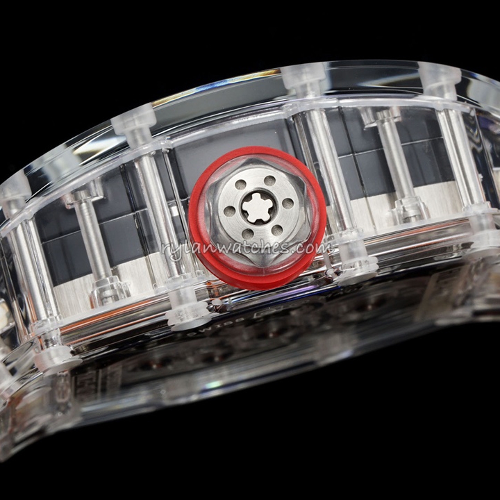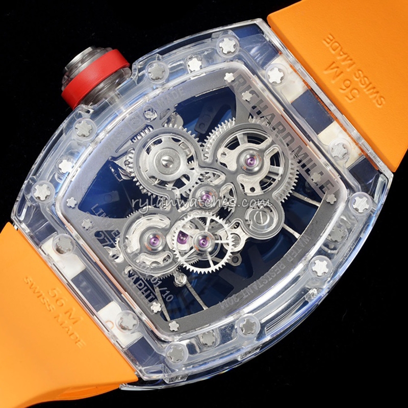 The semi-transparent rubber strap integrates naturally with the sapphire case, producing a futuristic, ultra-light design language that mirrors the aesthetic principles of the genuine RM 56 series. Its ergonomic comfort and visual purity make it one of the most striking transparent timepieces ever produced in the super clone category.