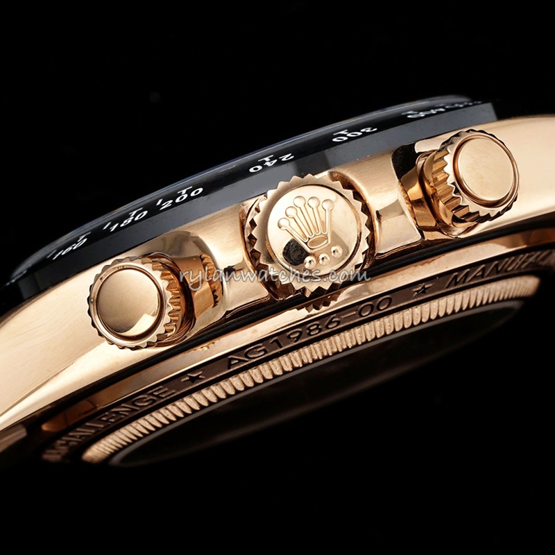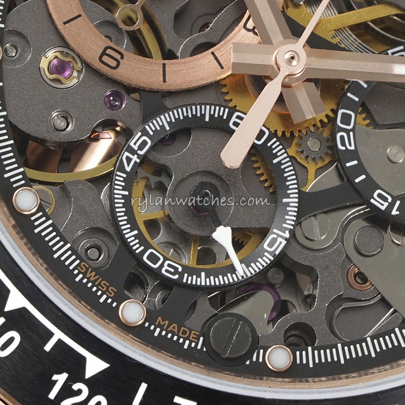 The Daytona Skeleton ADG Rose Gold Clone offers 5ATM water resistance, making it resilient for everyday wear. Sapphire crystal ensures scratch resistance, while the sealed crown and pushers maintain integrity against moisture and dust. Despite its artistic openness, this timepiece upholds the reliability expected from a Daytona.