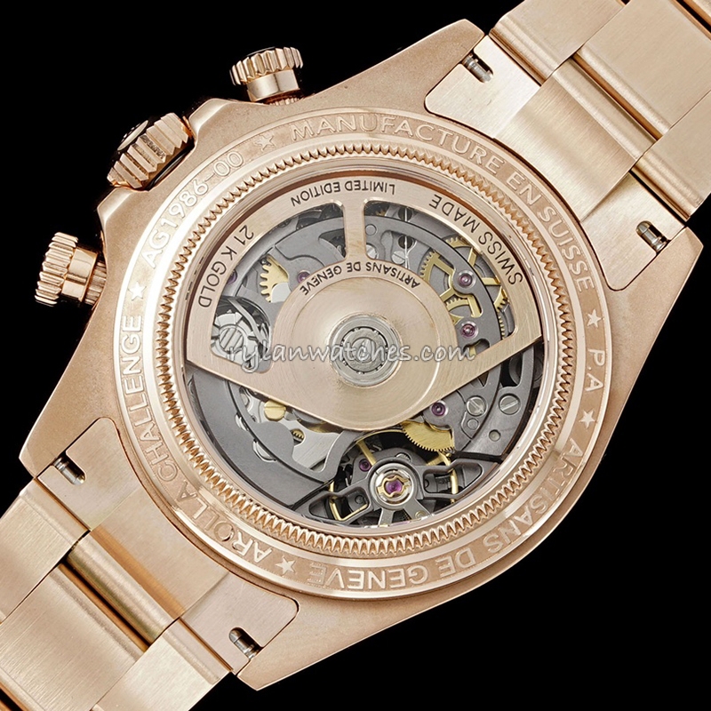 Rolex Daytona Skeleton ADG Artisans de Genève Rose Gold Clone combines a skeletonized Cal.4130 movement, rose gold case, and transparent chronograph artistry.